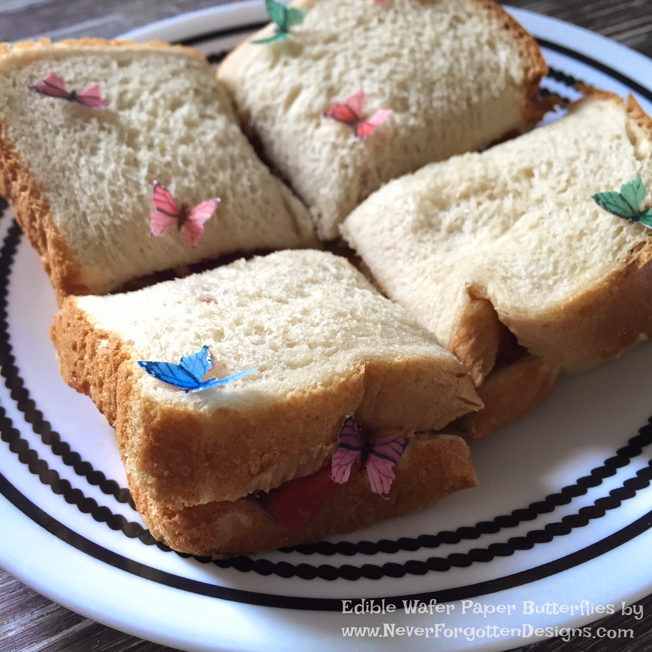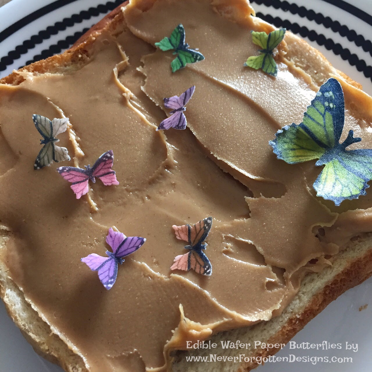 Today I felt like doing something different for my two youngest children for lunch and came up with an easy way to add to their happy childhood memory banks. Peanut butter sandwiches will never be the same in the Yates' household, as I grabbed a few of my edible butterflies and placed them inside and outside to jazz it up. These mini butterflies are printed with edible inks, on edible wafer paper which is composed of potato starch. Very similar to a communion wafer, wafer paper is nearly tasteless, dissolving when wet. Normally I place these on cakepops, brownies, cakes and cupcakes to dress them up.