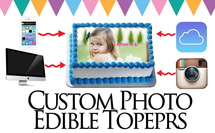 Take YOUR photos from your iphone, desktop or even Instagram and have printed with edible inks on edible frosting paper! Shipped to you for you to add to your own sheet cake, round cake, cookies, cupcakes and more!